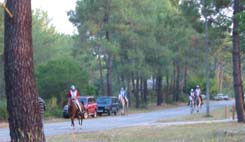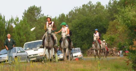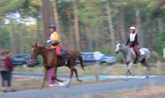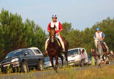 ![]() Akim et Maurice Saint, passent au point d'assistance où les suiveurs retrouvent leurs cavaliers parfois bien découragés par les sols souvent fouillants de cette partie du Médoc. |